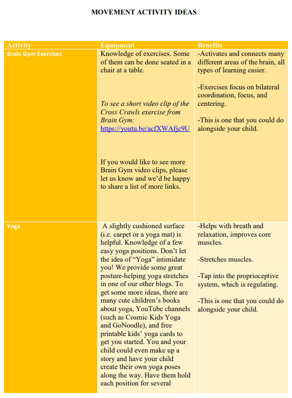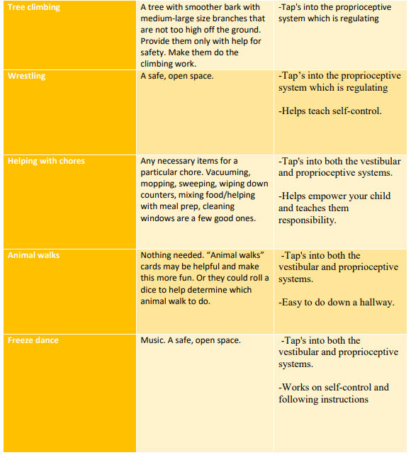 Not all movement activities are equally effective in terms of helping to regulate your child. Especially if your child has sensory processing challenges, helping them engage in sensorimotor activities that are regulating is optimal. What does that mean? To be regulated is to be in a calm, happy, and ready-to-learn state. For example, telling them to go run laps outside might work for some kids, but for others, it will hype them up and while helping them to burn off some pent up energy, it could make them dysregulated (losing control, hyper, silly).