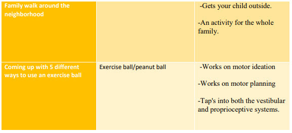 If your child is resistant to participating in these activities, provide them with choices, tap into what motivates them, and focus on making this a regular part of their daily routine. Help them understand the importance of getting their wiggles out during the appropriate times so that their body can feel calm and focused and ready to learn, as well as the importance of keeping the muscles in their bodies and hands strong. Help them to take advantage of the breaks that their teacher is providing them during the school day. We are here to support you and your child during this unprecedented and difficult time. Please reach out to your child’s therapist if you have any additional questions/concerns. We are all in this together!