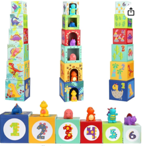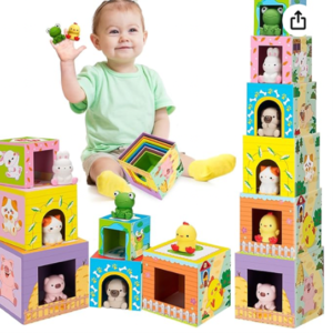 This toy introduces essential reciprocal play, spatial and temporal concepts, categories/sorting, and fine motor skills. You can highlight the different colors, the names of the animals, the sounds that the animals make, the location of where the animal lives/goes, and the sizes of the different boxes. Using the language strategy, you can use commenting to label what the child is doing (“the green box goes on top, the pig goes in, let’s stack, crash, the boxes fell, the pig is climbing up up up”) to help with expressive and receptive language growth.
