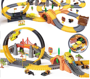 This toy is a fun way to work on joint play, fine motor skills, attending an activity for an extended period, using communication temptations to help illicit language, and using your imagination to build different tracks to race the cars around! For younger children, some target words during this activity are car, go, stop, beep beep, up, down, turn, uh-oh, in, open, close, and crash. You can also use this activity to work on 1 to 2-step directions (put the jeep in the tunnel and the dinosaur under the bridge), spatial and temporal concepts, taking turns, and imaginative play packed with vocabulary.