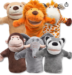 Puppets and dolls are a great way to help illicit language. You can work on everyday routines via physical and verbal modeling. When targeting initial sounds (such as p,b,d,m,n,h,w), you can pick words around the house and model them yourself using the puppet. The exaggerated features and familiar characters are appealing to children. This helps kids motivation to play and, in turn, imitate words and gestures. Some daily routines to involve the puppet or dolls are bath time, brushing teeth, getting ready for daycare/school, mealtime, toilet time, and clean up.