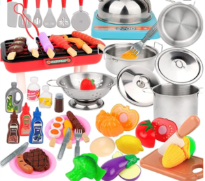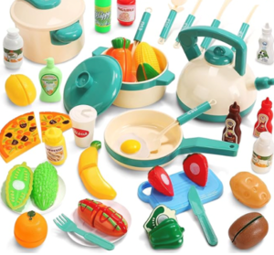 Kids love imitating their parents, which is why your child might be interested in kitchen tools and utensils, which is a great thing. Modeling, both verbally and gesturally, is one of the best ways to help expand your child’s language, and what better way to do it than to play with a toy that imitates a part of your daily routine? Pretend play with food can be very beneficial in helping increase the child’s vocabulary via commenting and naming the items (“juice, yummy juice, juice is in the cup”), repetition of language, giving choices (“Do you want the apple or the banana?”), and narration (“Good job pouring the juice into the cup, you’re drinking the juice, I have an apple on my plate”).